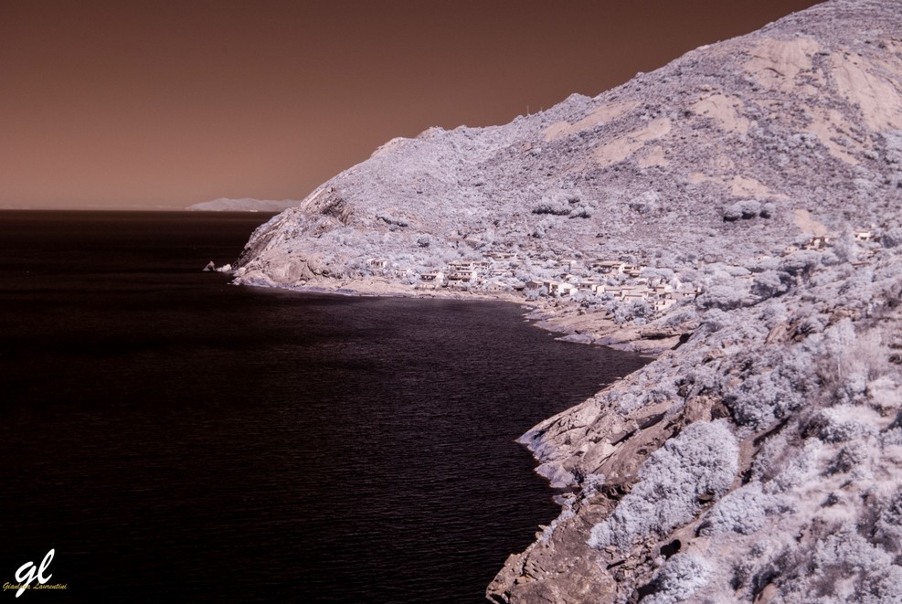 Nel 2024 ero impegnato in un workshop fotografico sull’Isola d’Elba quando un amico mi ha detto: “Ho portato la mia Nikon D90 modificata IR, vuoi provarla?” e non mi sono lasciato scappare l’occasione. Come ho già detto mi ha sempre incuriosito questa tecnica, prevalentemente per il fatto di non poter prevedere al 100% ciò che verrà registrato dalla fotocamera, in una reflex infatti il mirino è di tipo ottico. Ho così scattato qualche foto con questa fotocamera gentilmente prestatami e anche sapendo che la vegetazione appare generalmente chiara, quasi bianca, non potevo immaginare quanto il mare apparisse di un nero profondo con un corpo macchina del genere. Stavo vedendo la costa di Chiessi e in lontananza l’isola di Capraia con degli splendidi colori primaverili, ma quando fotografavo il risultato era completamente diverso da quello che vedevo e ciò mi sembrava incredibilmente affascinante.